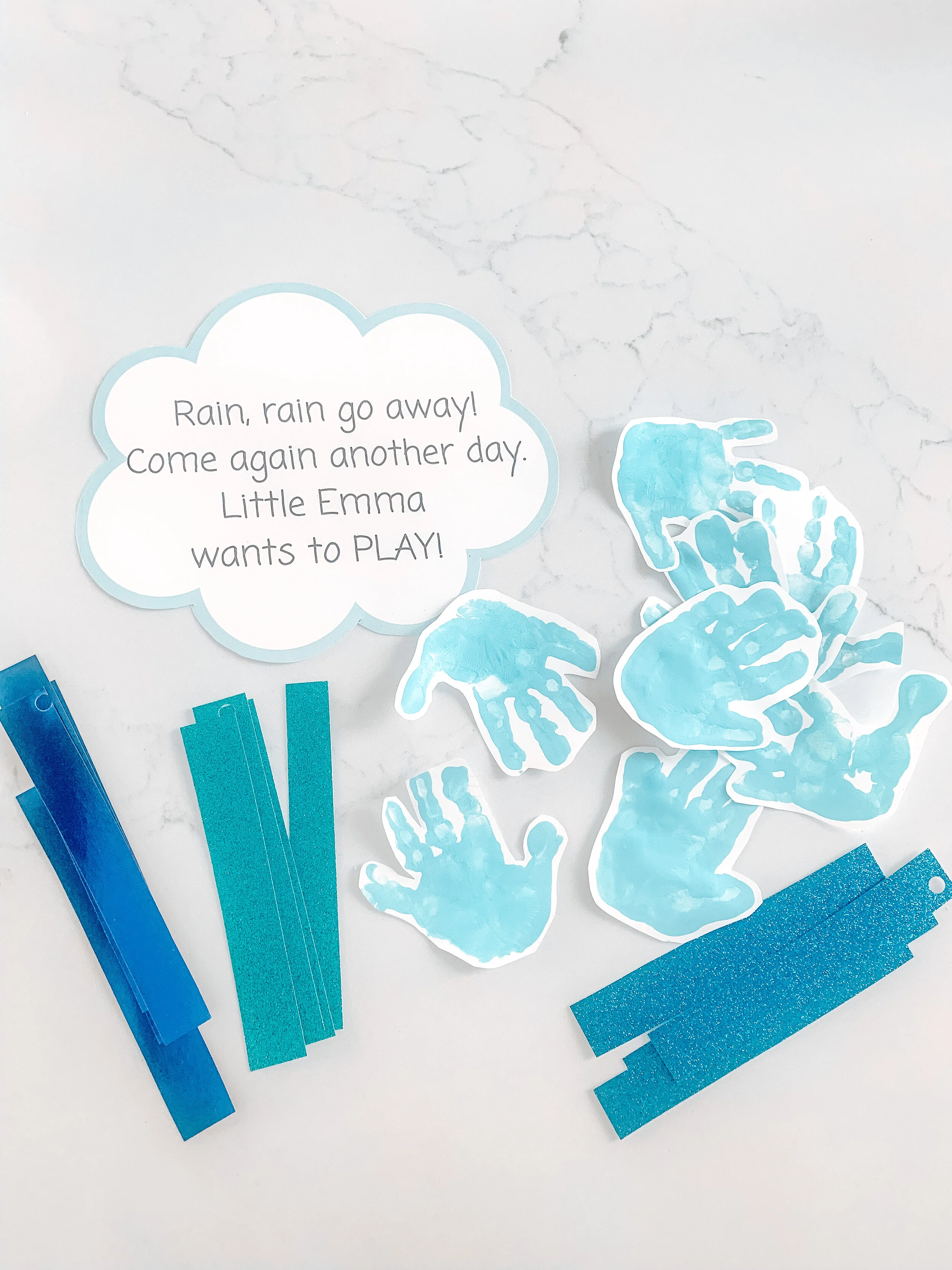 Then cut out cloud, strips of blue paper, and handprints.